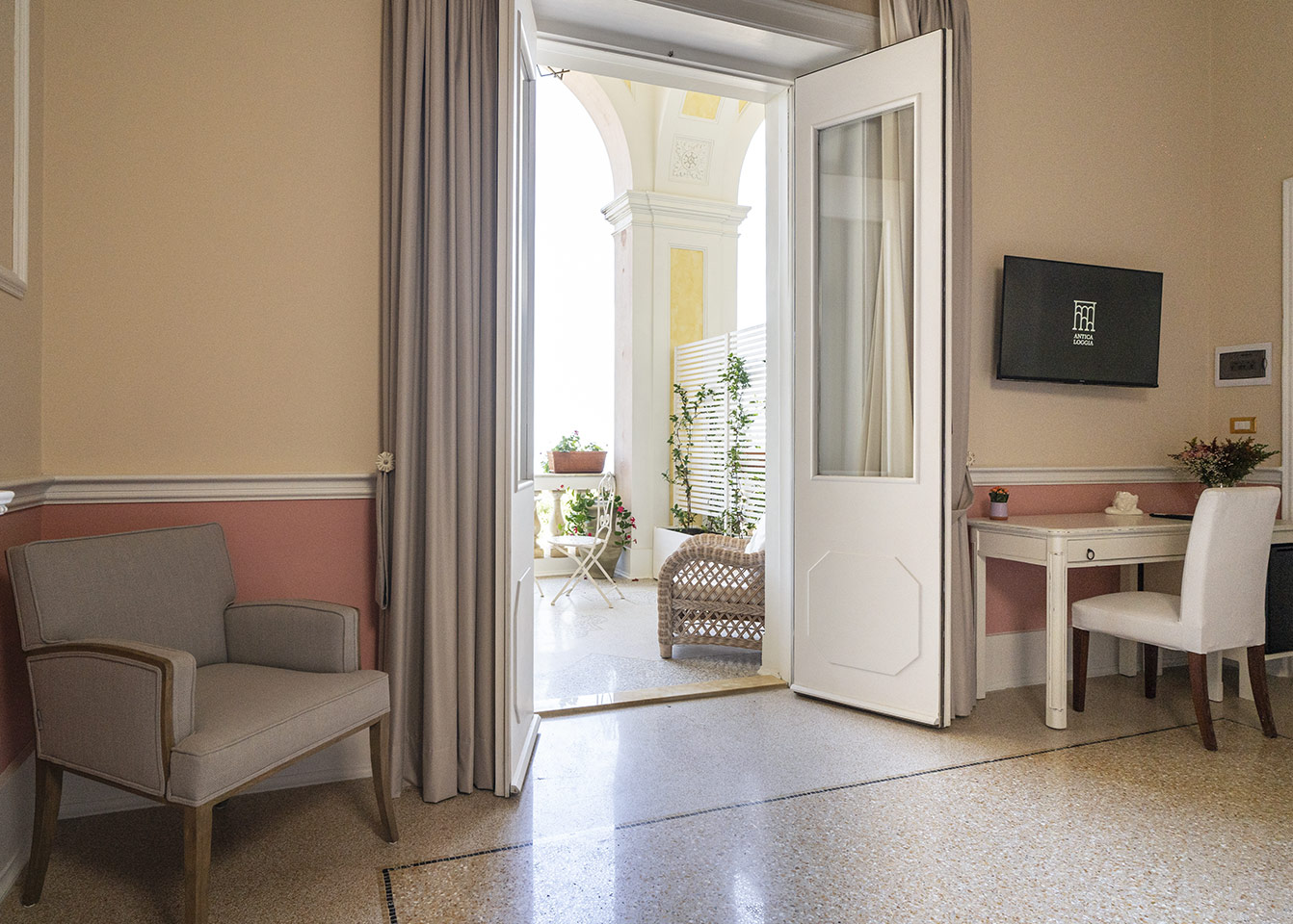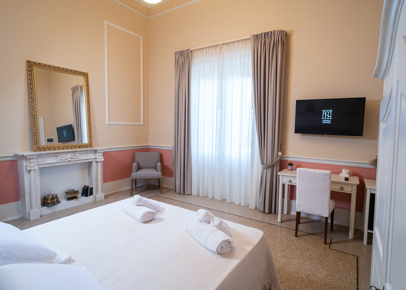 La camera DELUXE è il gioiello del B&B Antica Loggia, pensata per offrire un'esperienza di soggiorno unica e indimenticabile. Elegante e spaziosa, questa camera vanta un delizioso terrazzo privato dove poter gustare la colazione con vista sul Corso principale della città. Il letto matrimoniale domina la camera ed è circondato da dettagli delicati, come un grande quadro floreale dai toni neutri, che aggiunge un tocco artistico e di serenità all'ambiente. L'arredamento è curato nei minimi dettagli, con un tocco di classe dato da un autentico camino d'epoca incastonato nella parete, che regala un'atmosfera accogliente e ricercata. La camera è dotata di tutti i comfort. Perfetta per chi cerca un soggiorno all’insegna del relax e della raffinatezza.