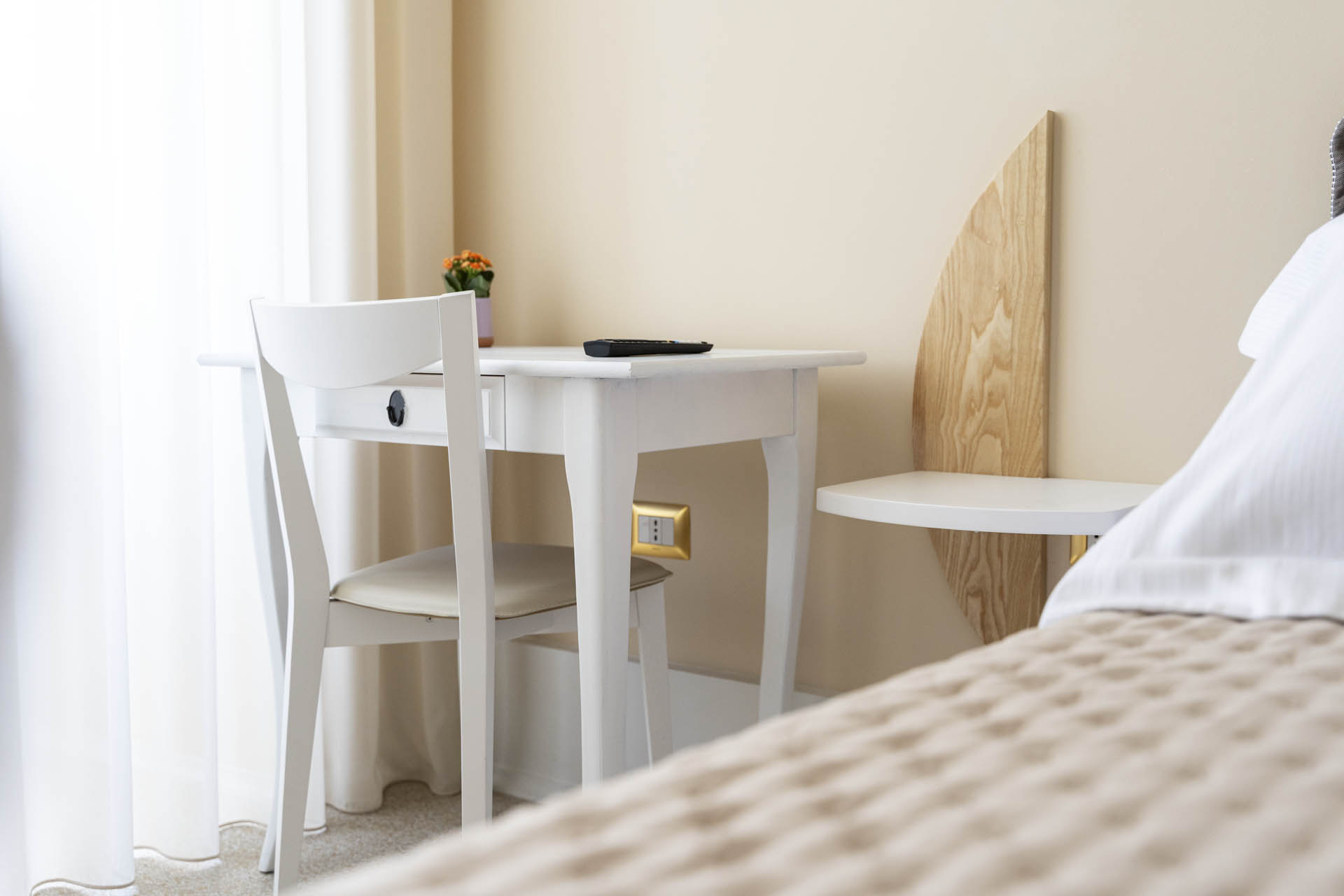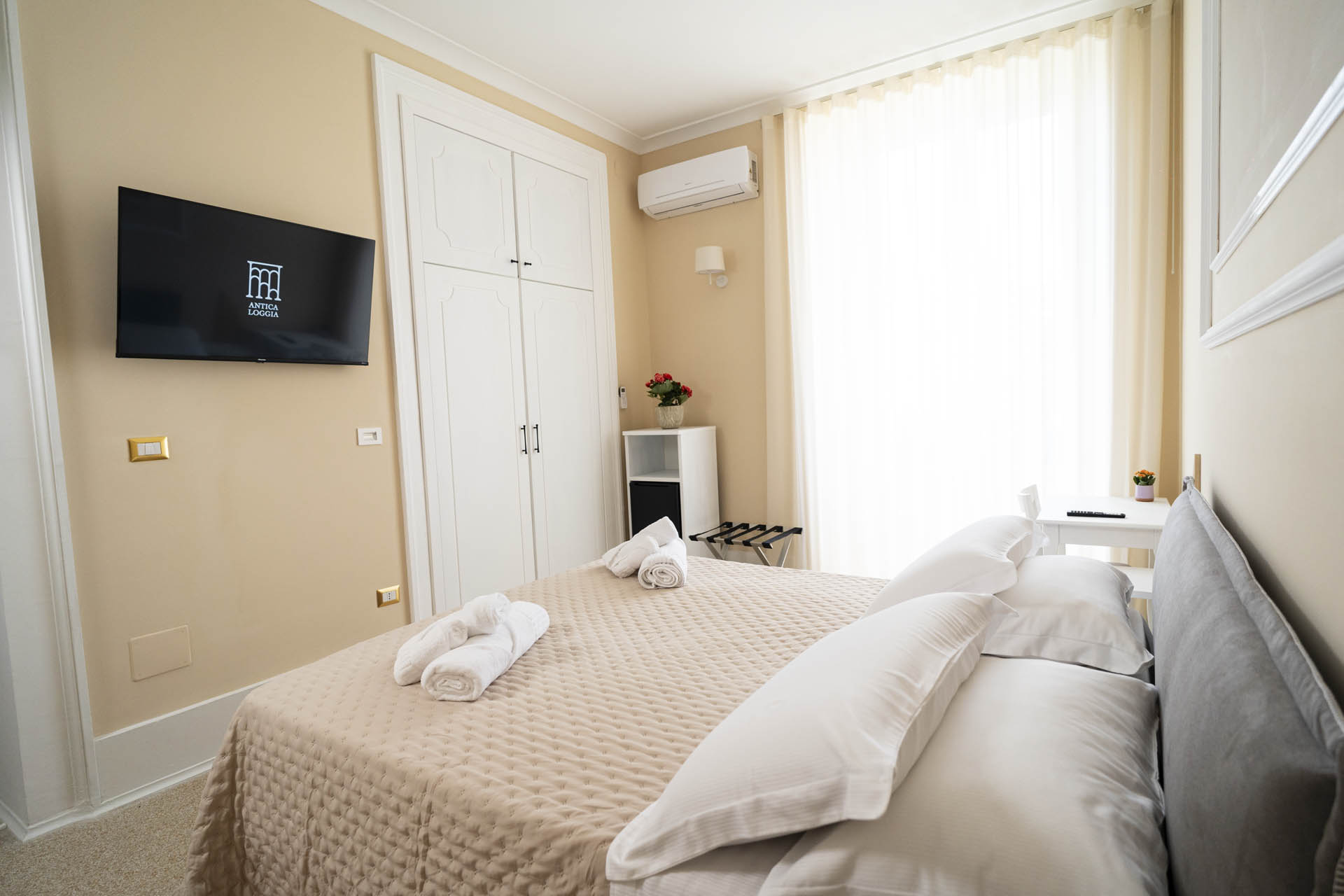 La camera Superior del B&B Antica Loggia si distingue per uno stile elegante e armonioso, caratterizzato da colori neutri e rilassanti. Il letto matrimoniale domina la camera, con una testiera imbottita di colore grigio che si integra con le pareti color crema .La luce naturale è abbondante, filtrata dalle grandi finestre del balcone antico , che affacciano su Corso Umberto, una delle vie principali della città, ed illuminano l'intero ambiente. Sulla parete, un quadro decorativo dalle forme geometriche incornicia lo spazio, conferendo un'ulteriore sensazione di ordine e stile.